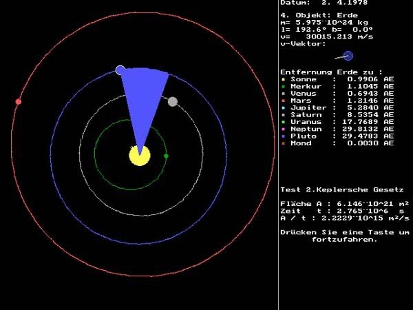 Hier wird das 2. Kepplersche Gesetz geprüft: Bahnfläche / Zeit = konstant